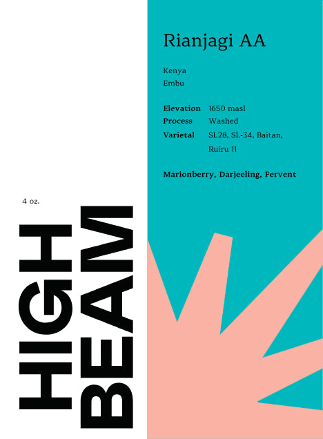 Rianjagi AA is a Kenya from Embu heavy with the deep, phosphoric purples and rich tannins that we seek in a classic Kenya profile. Dark berries are complemented with black tea florals to create an ocean of wide open sweetness.